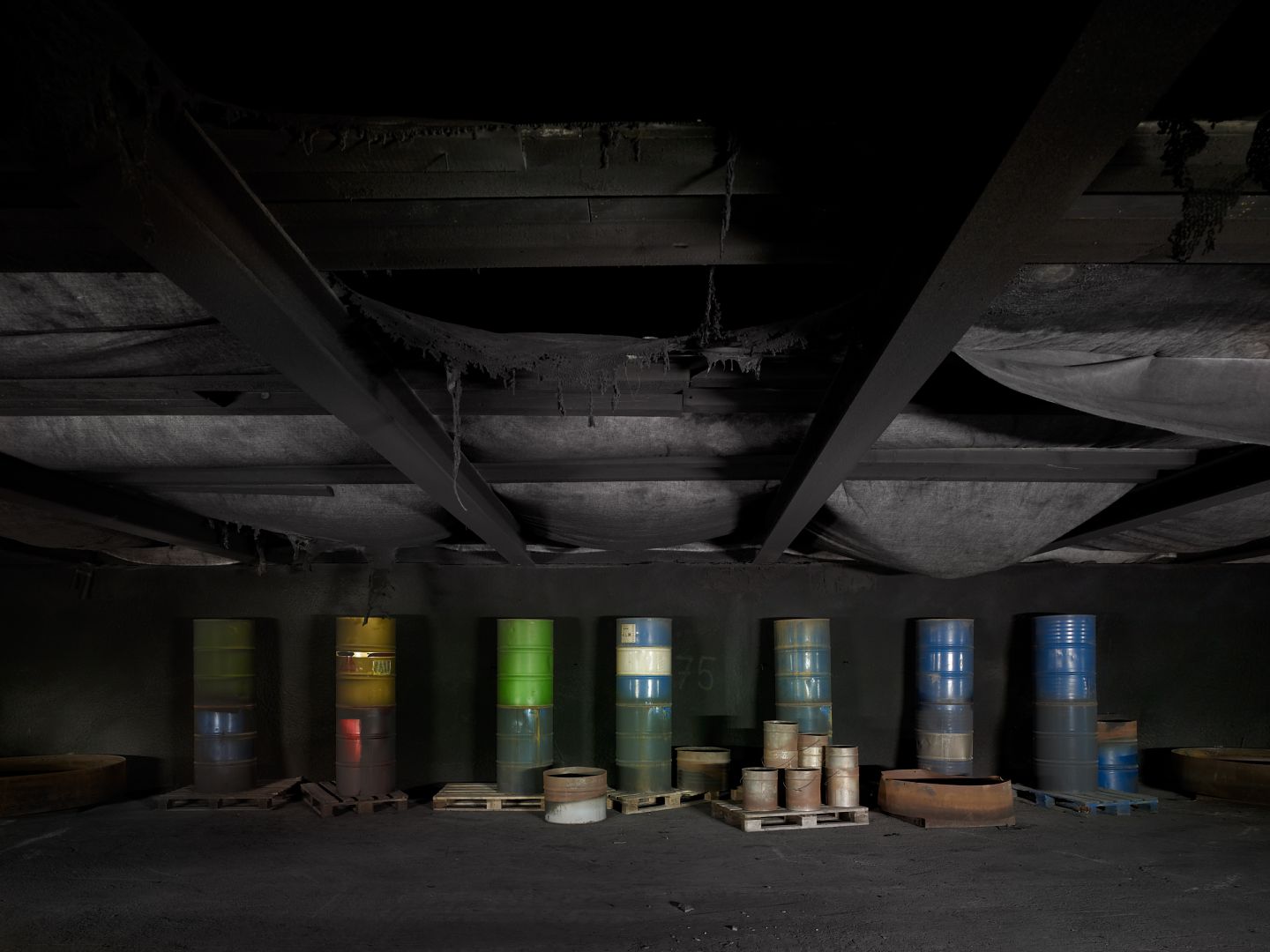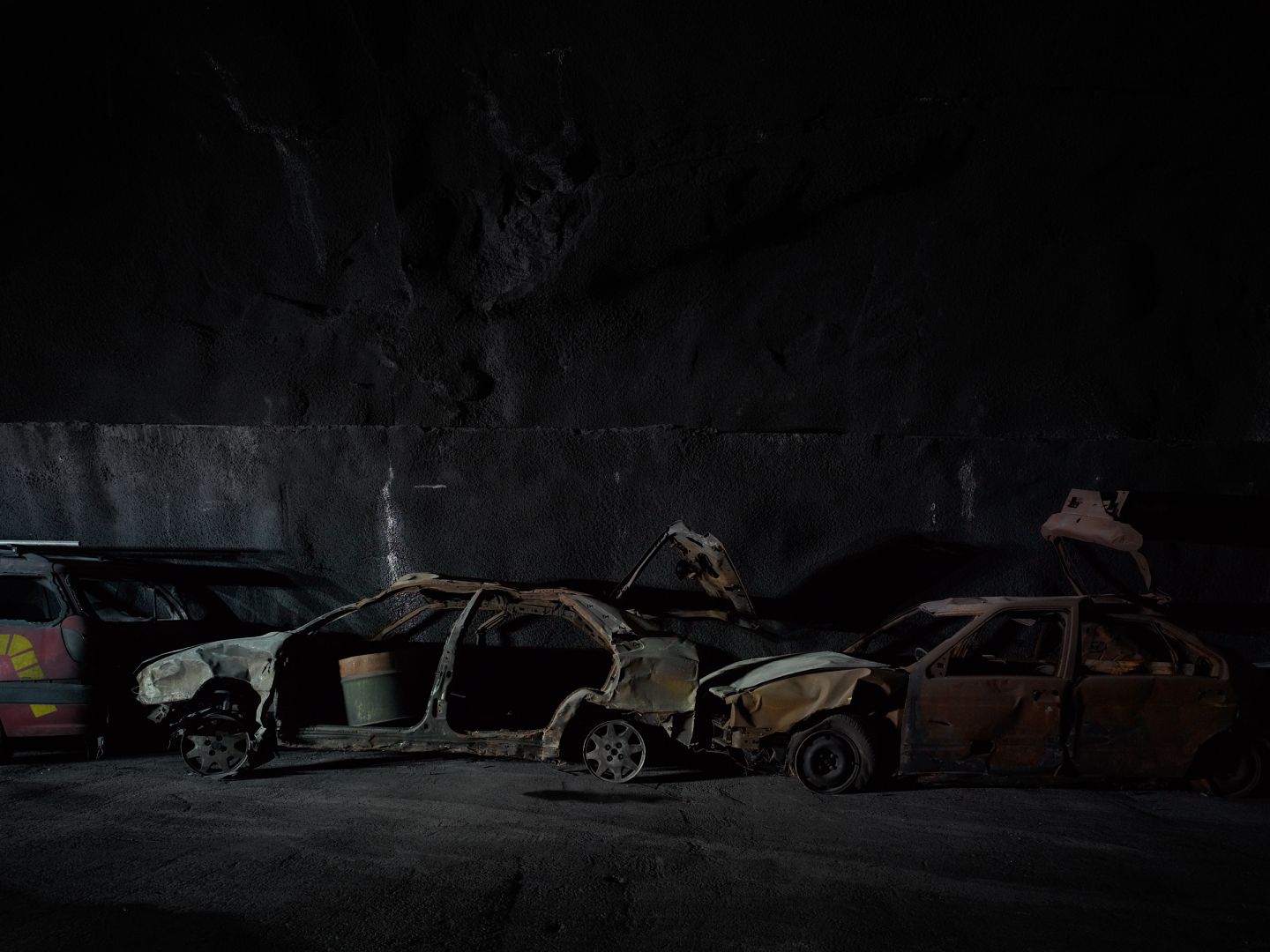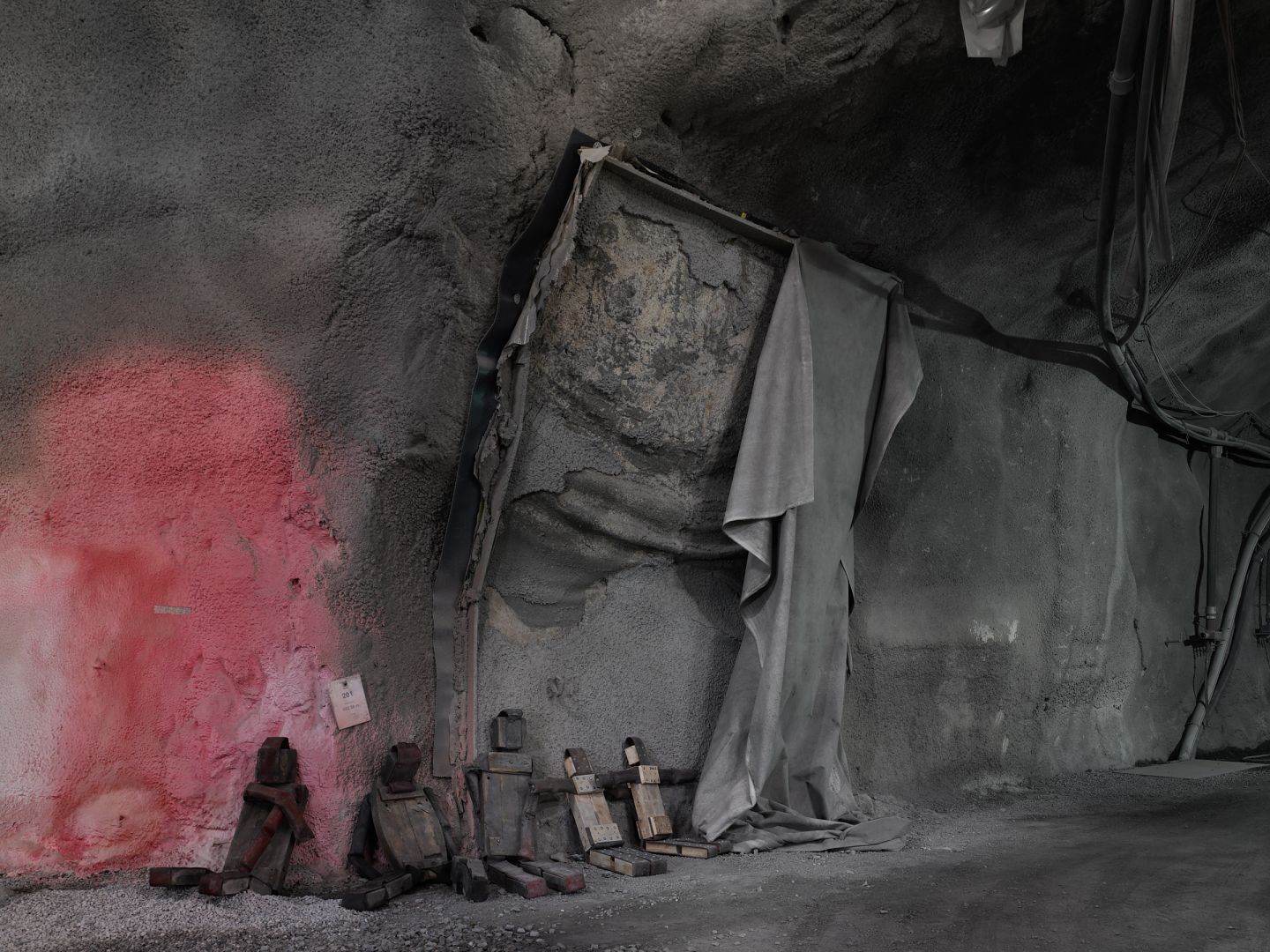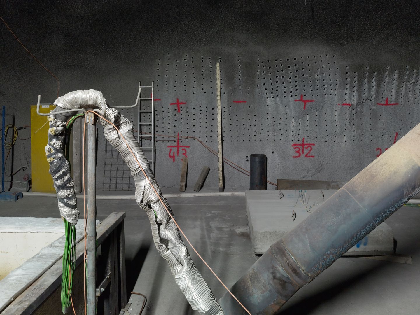 Die Bilder sind im Versuchsstollen Hagerbach bei Flums entstanden. Ein im Tunnelbau tätiges Unternehmen betreibt diesen Stollen seit 1970. Es werden Bauverfahren entwickelt und getestet. Die besonderen Risiken beim Bau und Betrieb von Tunneln versucht man mit Tests und inszenierten Unfällen in den Griff zu bekommen. Durch die von Ingenieuren geschaffene Versuchsumgebung im Berg entsteht eine für mich faszinierende verborgene Welt, deren surreale Elemente die Grenzen der Machbarkeit in der realen Welt erahnen lassen.